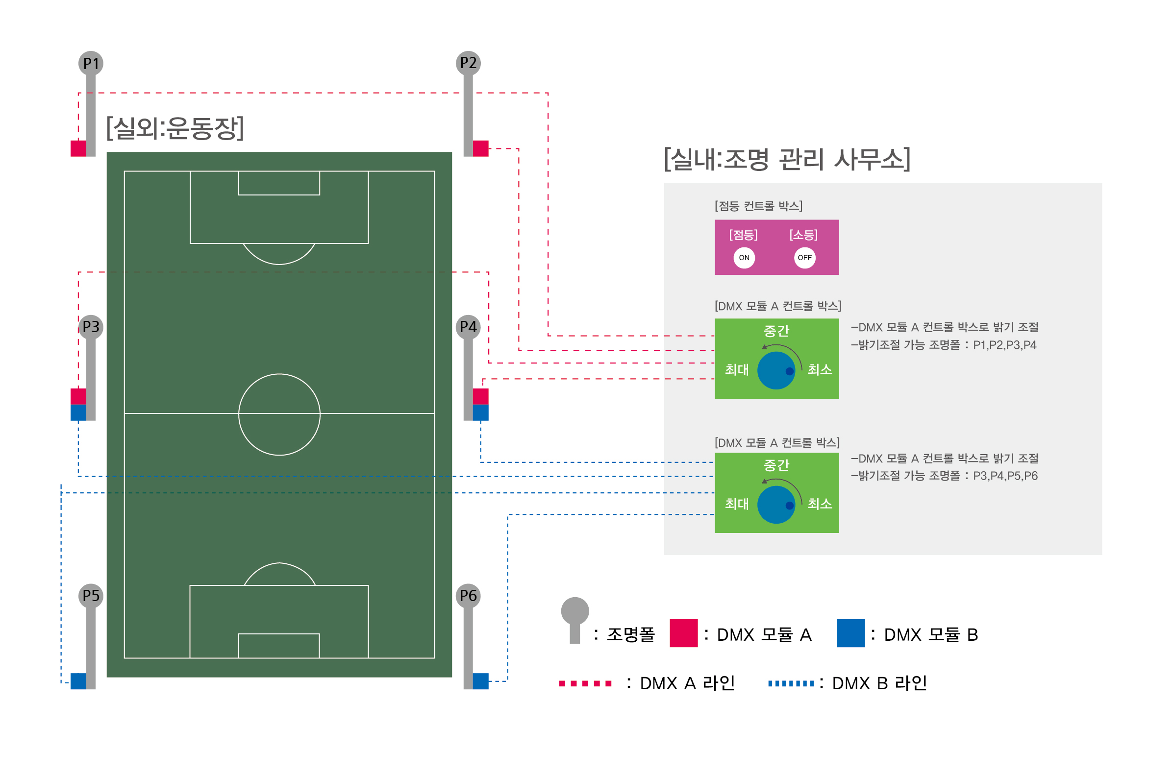 대공간 스포츠 환경에 DMX 컨트롤을 이용하여 각각에 조명을 온/오프 및